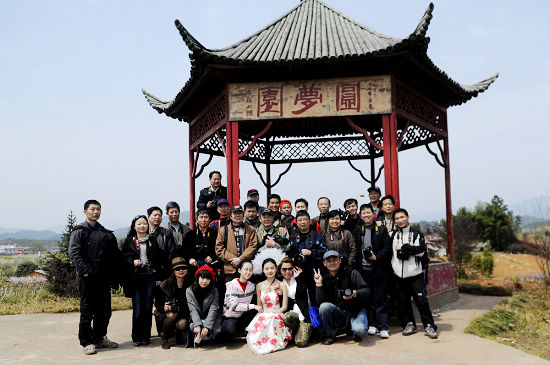 摄友们在桃花园圆梦园亭前合影。
