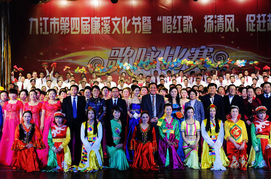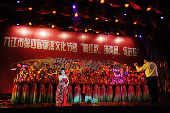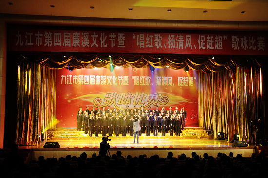 九江摄影网讯(沈双武)2011年3月30日下午,九江市第四届廉溪文化节暨“唱红歌、扬清风、促赶超”歌咏比赛在九江职业大学礼堂举行。省纪委常务副书记、省监察厅厅长汪毓华,省纪委常委李泉新,省纪委宣教室副主任傅兆良,市领导张学军、朱建国、彭群林、吴锦萍、卢志鹏和1500多名干部群众观看了歌咏比赛。