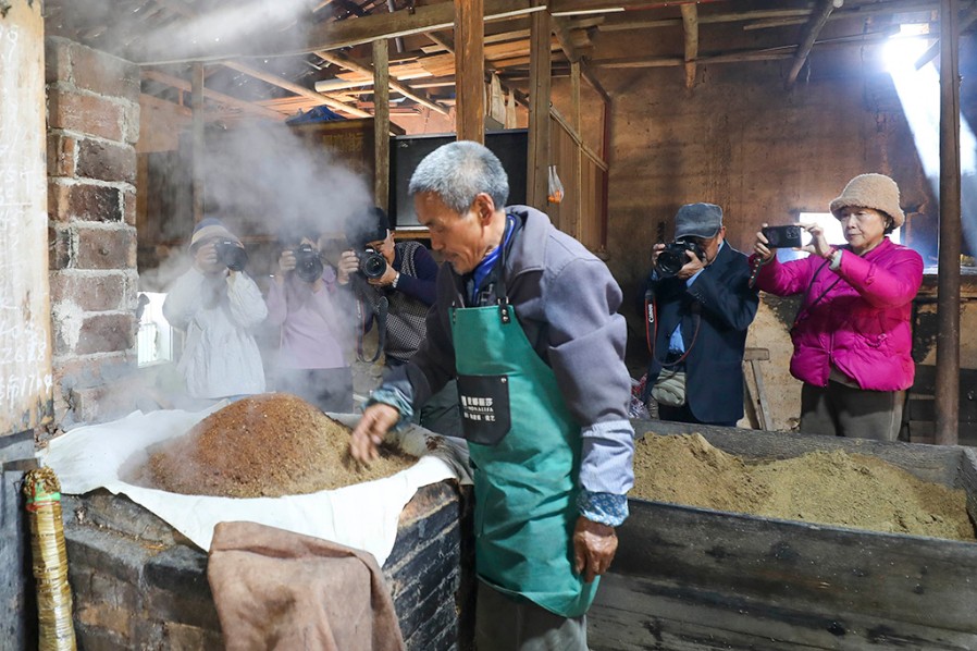 午后,众人转到一座传承百年的手工榨油作坊。一进门,醇厚的油香便扑面而来。作坊里,古老的木榨器具泛着温润的光泽,水动碾盘不停运转。烤籽、蒸粉、包饼、排榨、槌撞,每一道工序都成了拍摄的素材。师傅喊着铿锵的号子,挥动沉重而修长的撞针,每一次撞击都发出深沉的响声,金黄的油随之缓缓流出。飞溅的油星在光线下如碎金闪烁,摄影爱好者们凝神屏息,用镜头细致记录师傅们手臂的力度、额角的汗珠以及专注的神情,将这项古老非遗技艺的活力与温度,永远留存于影像之中。
