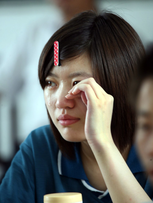 12日下午,在江西九江市晨光中学“绵阳班”告别会上,张珊同学不禁流下了眼泪。