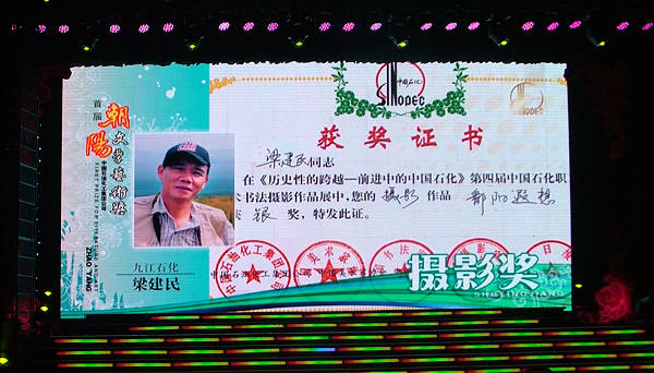 九江摄影网讯沈双武)5月6日,首届中国石化“朝阳”文学艺术奖表彰大会在南京金陵石化隆重召开。中国石化“朝阳”文学艺术奖是石化系统文学艺术创作成就最高奖,其包含文学、摄影、书画、音乐等类别;在119万石化职工内进行选拔,进入摄影类奖项13人,九江市摄影家协会副主席、九江石化摄协主席梁建民排名第6名,获得首届中国石化“朝阳”文学艺术奖摄影奖。