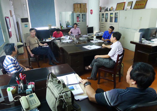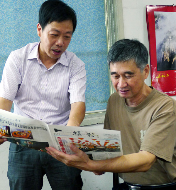 图为九江市摄协主席宋小勇向许景辉主席汇报《摄影》报的版面设置。