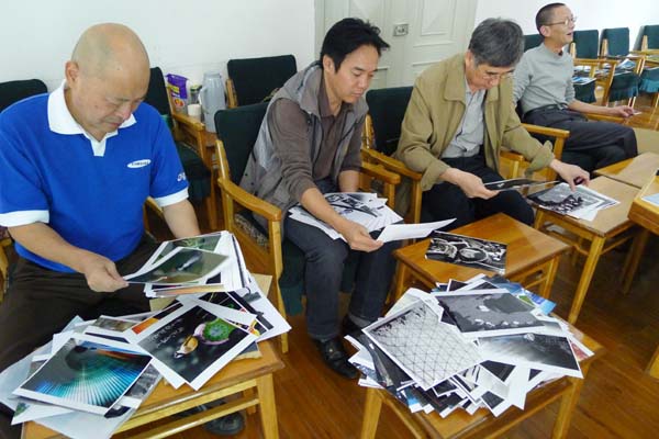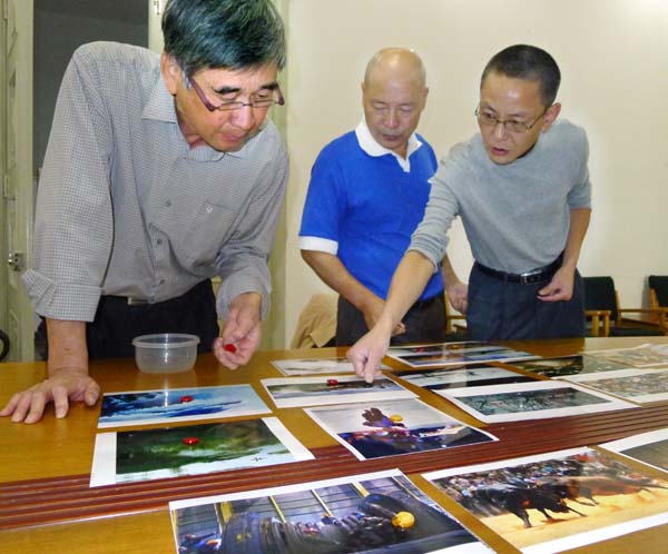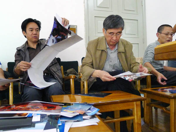 评委们认真审看每一幅(组)作品。