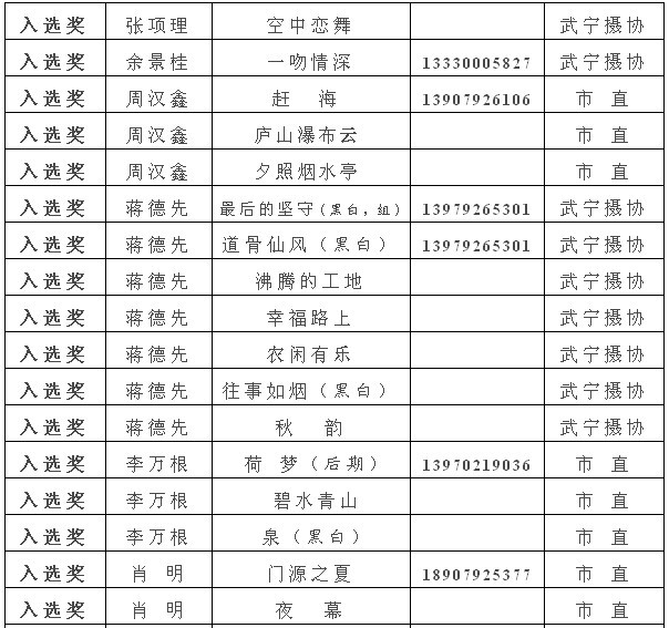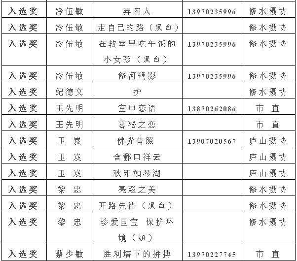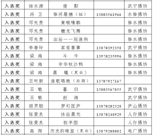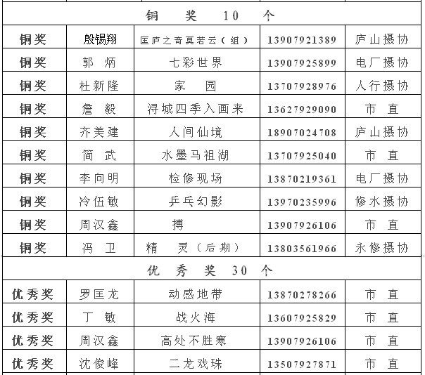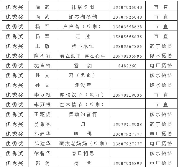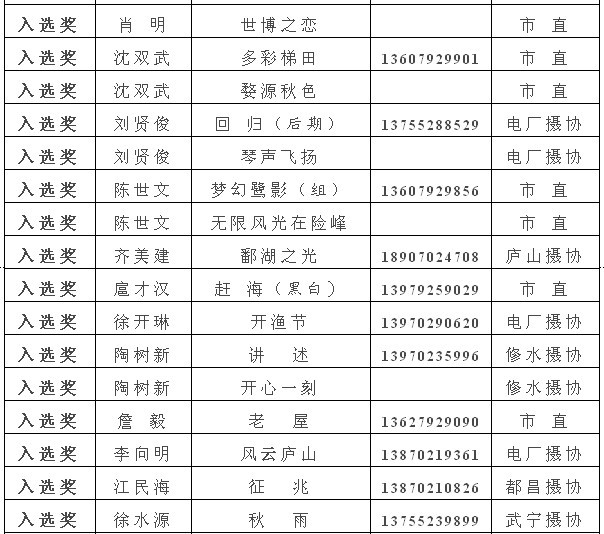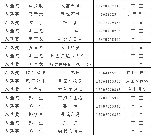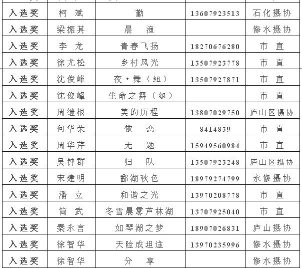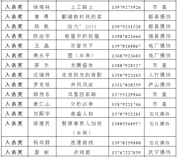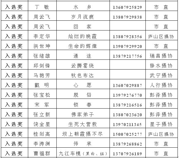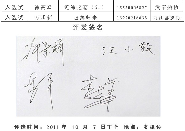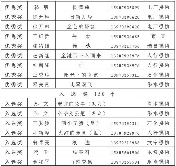 注:获得入选奖以上的作品,市摄协准备集体推选参加江西省第22届摄影艺术展,如果没有发送电子文件到陈杰或宋小勇电子邮箱的作者,请在10月10日晚7:00前将作品的电子文件发送至173877558@qq.com邮箱(一律为jpg格式电子文件,文件大小为500k以内。单幅照片长边为1000像素以内,组照由4-8幅组合,长边为1300像素以内)。10月13日后再将原始文件重发一次,用于放大市展览用。如果10月10日晚7:00前没有将电子文件发到指定邮箱,就视为作者本人自己将作品电子文件送省摄协了。省摄协截稿时间为10月12日,也欢迎作者自己传送。