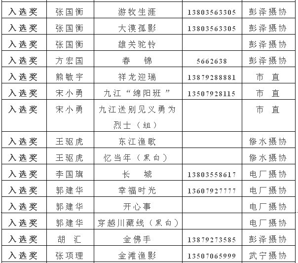 九江摄影网讯(沈双武)10月7日下午,第三届九江市摄影艺术展作品评选在南昌揭晓。参加这次展览选送作品的作者达150余人,选送作品达1050余幅(组),参与作者的人数和选送作品的数量都创历史最高纪录。原来在“征稿启事”中计划将作品分成彩色类、黑白类、后期制作类三类评选,后来黑白类和后期制作类选送的作品还不达100幅(组),且作品的质量大多达不到一定的评选要求,所以,经市摄协领导与评委商定,将三类合并成一类评选,但仍然保留了4个金奖,将银奖调整为6个,铜奖调整为10个,优秀奖调整为30个。 担任这次评委的是江西省摄影家协会主席许景辉、副主席汪小毅,省摄协常务理事、摄协活动部主任李志华,省摄协常务理事、江西日报九江分社副社长燕平。九江市摄影家协会主席宋小勇、副主席杨青、陈杰、梁建民作为工作人员观摩了这次评选。为了充分体现公平、公正,在评选过程中,评委不翻看作品背后的作者名字,市摄协领导也不能发表任何意见。燕平评委认为自己在九江工作、生活的时间较长,对有些作品、作者可能熟悉,在进行等级奖评选时,主动要求回避、不参加评选。 请获得入选奖以上的作者,按要求将电子文件发至指定邮箱,以便及时参送江西省第22届影展。同时也请将作品原件发送到指定邮箱,以便制作展览的照片。市摄协将择日举行展览和颁奖仪式。