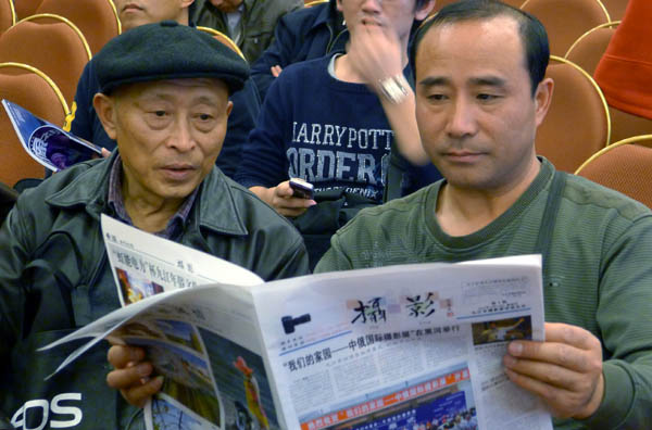 分公司总经理美野川久裕在阅读九江摄协的《摄影》报。