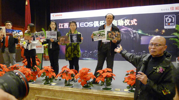 九江摄影网讯(李涛渊)11月26日,江西天强佳能EOS俱乐部启动仪式暨《感恩大自然》朱英培摄影作品展在江西饭店和天强数码总店举行,佳能(中国)有限公司高级副总裁吉冈达生,副总裁、华东区域总代表、上海分公司总经理美野川久裕,佳能(中国)有限公司影像消费产品事业部副经理刘新棡,省摄协主席许景辉,副主席沈南、廖国良、游泳、汪小毅,天强数码科技有限公司董事长胡伟云等参加了启动仪式并致辞,九江市摄协以主席宋小勇、副主席罗匡龙为领队的市部分摄协代表也应邀参加。九江市摄影家协会会刊《摄影》报成为与会嘉宾的抢手报纸。 启动仪式上,中国摄影家协会会员,中国新闻摄影学会理事,《民族画报》社高级记者,教授、资深摄影家成卫东以雪域高原生态和地理环境为主题,为现场摄影工作者、摄影爱好者进行了一场精彩摄影讲座。