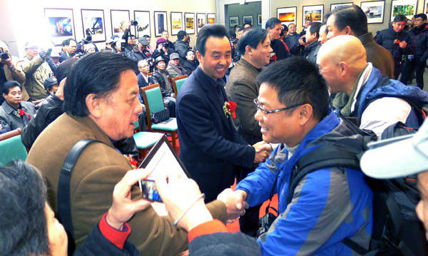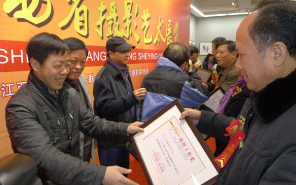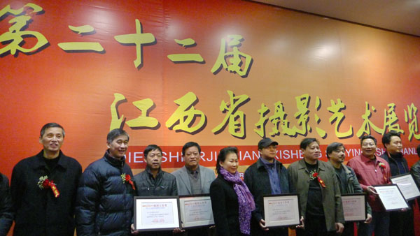 九江摄影网讯(李涛渊)12月18日,为期5天的第22届江西省摄影艺术展览在省文联大楼展览大厅开幕,省文联副主席鄢平原,省摄影家协会主席许景辉等为获得奖项的个人和组织工作奖的单位颁奖。九江市摄影家协会主席宋小勇、副主席蔡杰,副秘书长沈双武、李涛渊等率九江100余名摄影人参加了开幕式。 据了解,本次摄影展收到了全省各地千余名作者近9000幅(组)摄影作品,分彩色、黑白、后期制作三个组,共评出了金、银、铜奖作品75幅(组),优秀奖作品120幅(组)。我市有14幅(组)作品分获金、银、铜奖,12幅(组)作品获得优秀奖,有40幅(组)作品获得入选,其中,《传承》(作者李涛渊)、《无限风光在险峰》(作者陈世文)、《万人泼水大狂欢》(作者莫英连)获彩色类金奖,《城市建设者》(作者徐海林)获后期制作金奖,金奖获得数量位居全省各参赛单位、各设区市之首。周汉鑫、徐开琳分获银奖,杨帆、唐晓天、徐智华、杜新隆、沈海江、胡灵聪、龚永平、徐海林分获铜奖。同时,九江市摄影家协会还获得优秀组织工作奖。 在随后举行的省摄协四届八次常务理事会上,宋小勇被增补为省摄协常务理事。