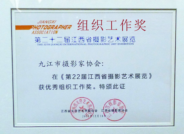 九江市摄影家协会获得优秀组织工作奖奖状。