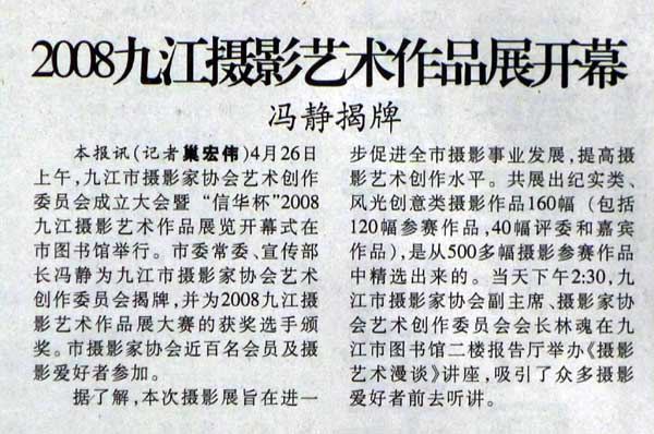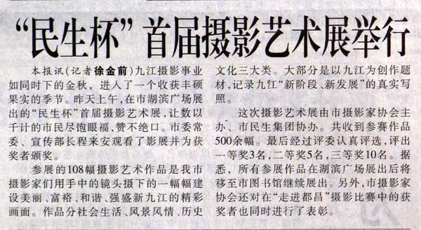 九江摄影网讯(沈双武)12月24日上午,由市文联、市摄影家协会主办的,为期5天的第三届九江市摄影艺术展览在市图书馆开幕。 参加开幕式的领导和来宾有:市委巡视员、九江市摄影家协会顾问朱建国,市委常委、市委宣传部部长潘熙宁,市政府副市长廖奇志,市政协副主席李军,江西省摄影家协会驻会副主席徐渊明,江西省摄影家协会活动部主任李志华,市委宣传部副部长陈则仁,市政协副秘书长郭建林,市文联党组书记、主席张国宏,市文联副主席陆建珠,江西日报社九江分社副社长、九江市摄影家协会顾问燕平,九江日报社副总编、九江市摄影家协会主席宋小勇,九江市人民银行调研员、九江市摄影家协会常务理事杜新隆,九江市摄影家协会第二、三届理事会主席万心华,九江市摄影家协会名誉主席洪世坤,九江市摄影家协会顾问田小元,市政府信息办副主任、九江市摄影家协会特邀理事江汉民,九江日报社副总编、九江市摄影家协会特邀理事周云飞,庐山区政协副主席、九江市摄影家协会特邀理事宋斌,市委宣传部文教科科长唐厚强,九江市图书馆馆长余海,以及九江市摄影家协会副主席蔡杰、杨青、邹树汉、陈杰、罗匡龙、梁建民等。 朱建国、潘熙宁、廖奇志、李军、徐渊明等为获得金、银、铜奖的作者和获得优秀组织奖的单位颁奖。潘熙宁宣布展览开幕,张国宏致辞,宋小勇主持,陈杰宣布获奖名单。 张国宏在致辞说,近两年来,我市广大摄影工作者、摄影爱好者坚持深入生活、贴近社会、贴近群众,注重用摄影的独特视角,记录时代风云,反映民生百态,捕捉精彩瞬间,创作了一大批有生活、有特色、有品位的精品力作,并在国际国内和全省重大摄影赛事中屡创佳绩。本届摄影展展出的220余幅作品,是省摄影家协会组成的评选组,从150多名作者的1100余幅(组)应征作品中遴选出来的精品佳作。参展作者人数和选送作品数量都创九江历次摄影展览之最。参展作品以敏锐的视角、丰富的摄影语汇和高超的艺术技巧,记录和反映了九江近年的沧桑巨变,讴歌了九江人民“两区互动、强工兴城”的伟大实践和取得的辉煌成就,全面展示了我市摄影创作队伍的整体实力和艺术风貌。 本届影展共评出4个金奖,6个银奖,10个铜奖,30个优秀奖。其中,徐开琳、唐晓天、洪显智、徐智华获得金奖,詹毅、梁海、杜新隆、宋小勇、莫英连、翁第亮分获银奖,殷锡翔、齐美建、郭炳、李向明、杜新隆,詹毅、简武、周汉鑫、冷伍敏、冯卫分获铜奖。同时,九江发电厂协会、修水县摄影协会、武宁县摄影协会获得优秀组织工作奖。 参加开幕式的还有各县(市、区、山、企事业)摄协的主席和会员,共计300余人。