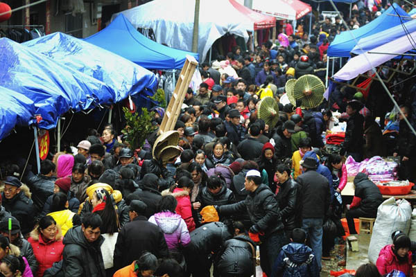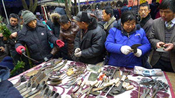 农民在庙会上购置农具。