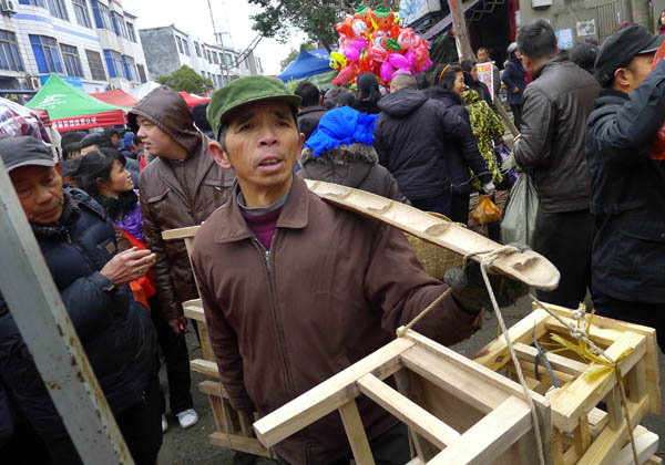一农民挑着自己加工制作的板凳到庙会上销售。