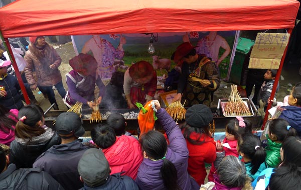 新疆烧烤在庙会上。