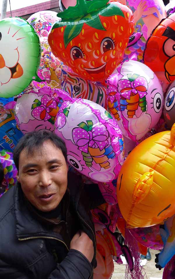 在庙会上销售儿童气球的小商贩。