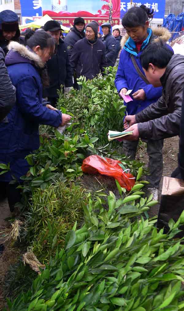 农民在庙会上购置果树苗。