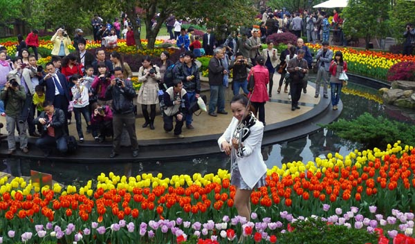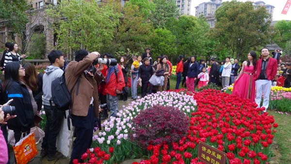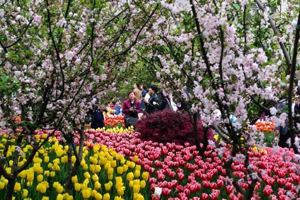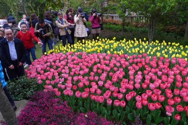 广大市民和摄影爱好者在欣赏郁金香带来的美景。