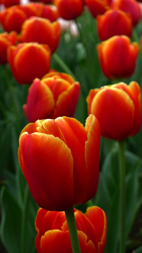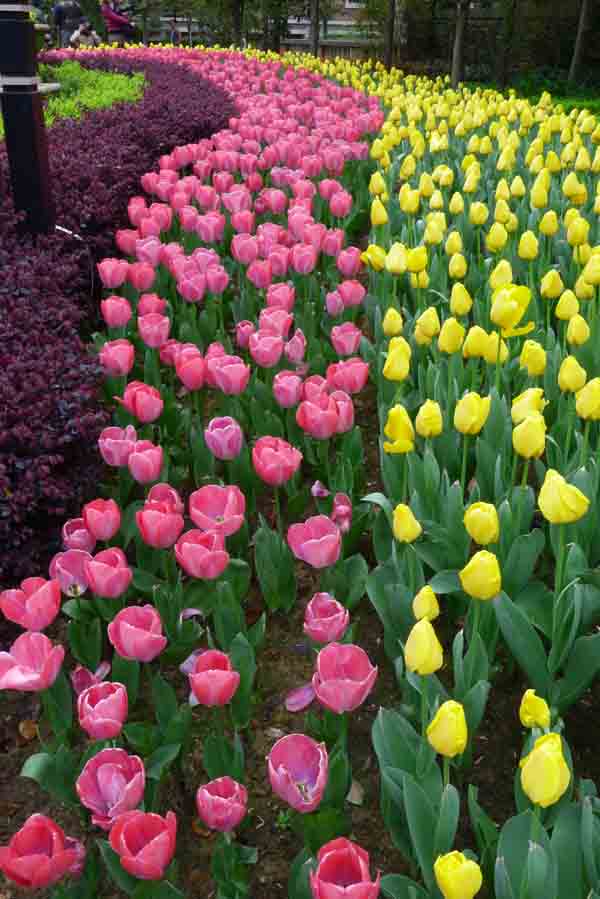水红色和黄色两种郁金香形成一幅美丽的图画。