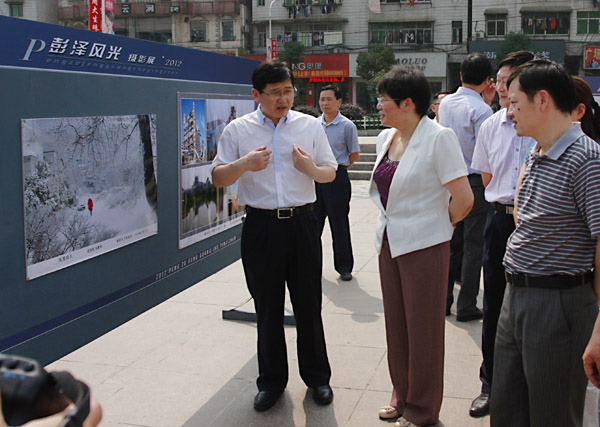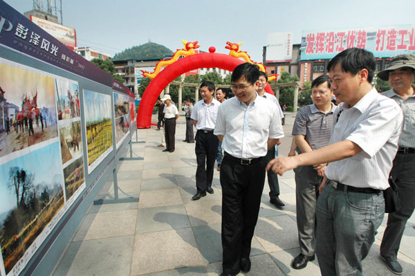 彭泽县委副书记、县长宁小球与市摄协主席宋小勇等参观摄影展览。