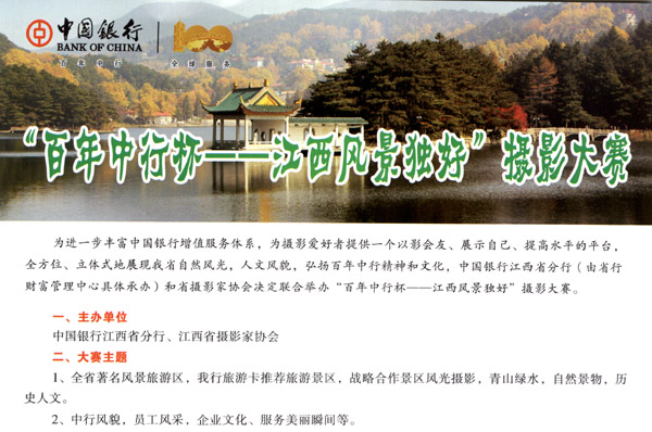 为进一步提升中国银行中高端客户品牌影响力,为摄影爱好者提供以影会友、提高水平的平台,中国银行江西省分行和江西省摄影家协会于7月8号在江西省林科院联合举办了“百年中行杯——江西风景独好”摄影大赛启动仪式暨媒体发布会。为进一步丰富中国银行增值服务体系,全方位、立体式地展现九江自然风光,人文风貌,弘扬百年中行精神和文化,做好此次活动的宣传,对接省行、省摄协的活动,中国银行九江市分行、九江市摄影家协会特联合举办“百年中行杯——江西风景独好”摄影大赛分站赛活动。具体方案如下: