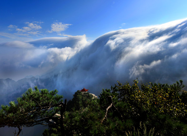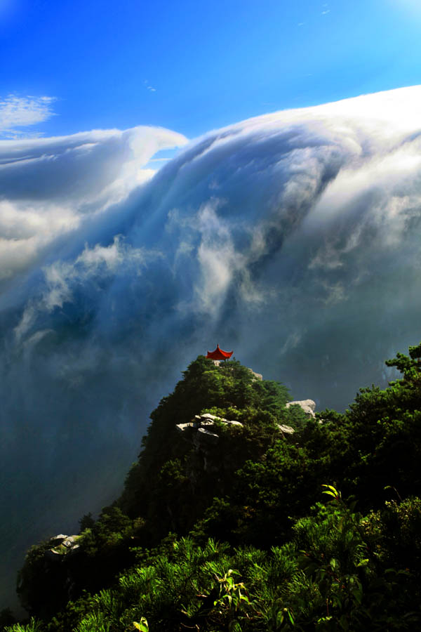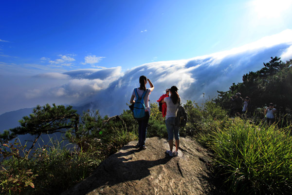 九江摄影网讯(殷锡翔)庐山经历了三天大风暴雨,7月24日早上7:30转晴便出现了瀑布云,蓝天白云十分壮观,时间持续了近两个小时。观云亭上挤满了摄影爱好者与来山的游客,他们争相目睹与拍摄了这一独特的壮观绝景,留下了难得的精彩瞬间。有来自湖南、湖北、广东、河北、辽宁、江苏、四川的摄影爱好者与游客,他们虽然早巳耳闻欣赏了庐山瀑布云的照片,然而今天亲身感受和目睹了瀑布云的排山倒海、气壮山河的真情实况,不由兴奋得跳跃、欢呼,留连忘返。 据悉,庐山瀑布云产生的最佳时间为每年仲春与初秋(四五月或八九月)色彩最好,早上7点至9点侧逆光照耀层次质感光影具佳。