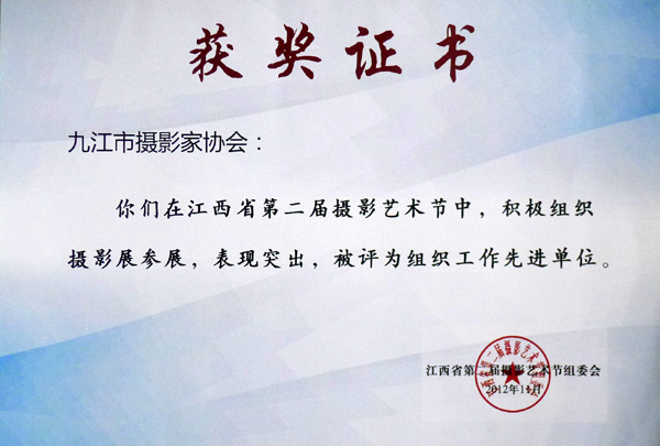 九江市摄协获得“优秀组织工作奖”证书。 (陈敬瑞 汪立新 摄) |