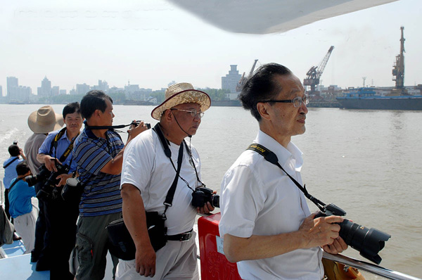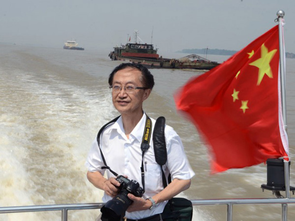 2012年7月4日,孙仁贵参与采访拍客进警营活动,在九江水上公安巡航随时的随拍。(包宗贵 摄)