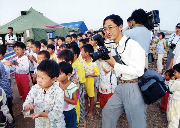 1998年9月1日,孙仁贵在九江县江洲镇采访灾后学校按时开学的情景。(燕 平 摄)