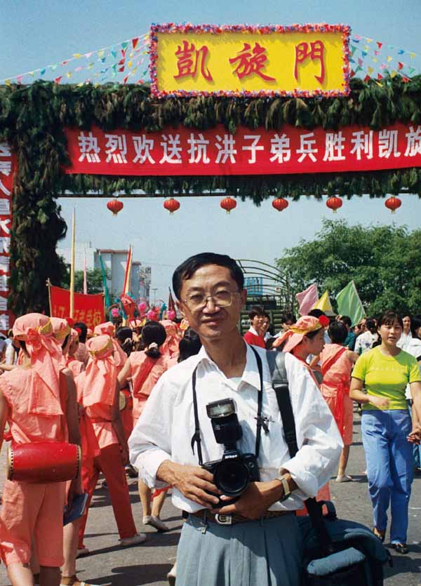 1998年9月,孙仁贵在九江军民欢送参加抗洪的解放军官兵凯旋地采访。(宋小勇 摄)