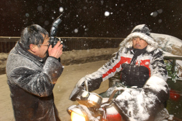2008年2月1日晚上10点,孙仁贵在九江长江大桥冒着暴雪采访风雪送菜人。(燕 平 摄)