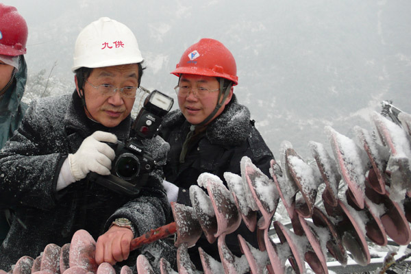 2008年1月28日,孙仁贵冒着冰雪爬山采访庐山区供电公司抢修电网主塔。(燕 平 摄)