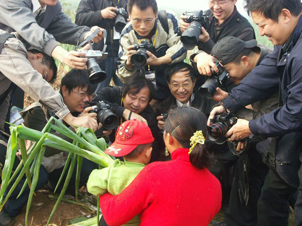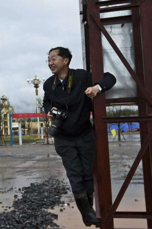 2010年4月21日,孙仁贵为了寻找更好的角度,爬高摄影。(燕 平 摄)