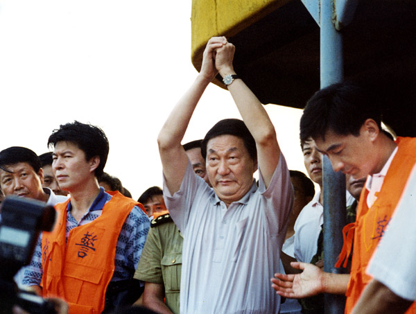 1998年8月9日,时任中共中央政治局常委、国务院总理朱镕基亲临九江城防堤4~5号决口处,登上沉船船舷,亲切看望和慰问。 (孙仁贵 摄)