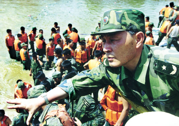 1998年8月,南京军区某部官兵在九江长江大堤4-5号决口处堵决口。(孙仁贵 摄)