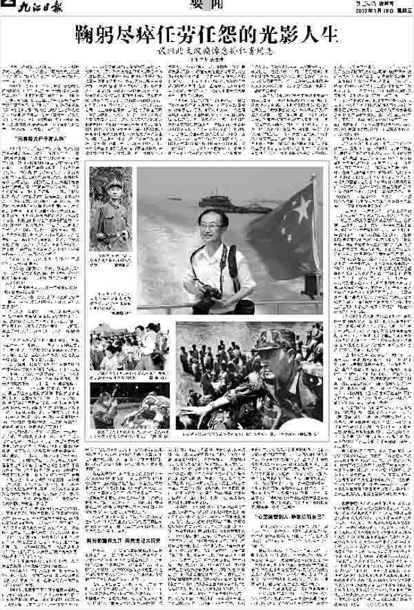 2013年1月18日的《九江日报》第二版,以整版的篇幅发表记者洪世坤撰写的悼念文章《鞠躬尽瘁任劳任怨的光影人生》。 (报纸截图) |