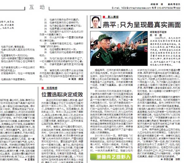 (注:此文刊发于2013年1月22日《中国摄影报》第二版“崇德尚艺摄影人”专栏。该专栏系列报道的对象均为获得过中国摄影家协会“德艺双馨”称号者。燕平现为中国摄影家协会会员、江西省摄影家协会常务理事、江西日报九江分社副社长、九江市摄影家协会顾问。) |