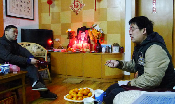 1月27日晚,江西日报记者张绪鸿(右)在孙仁贵同志家里采访。(宋小勇 摄)