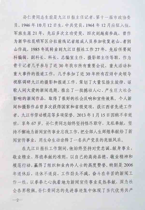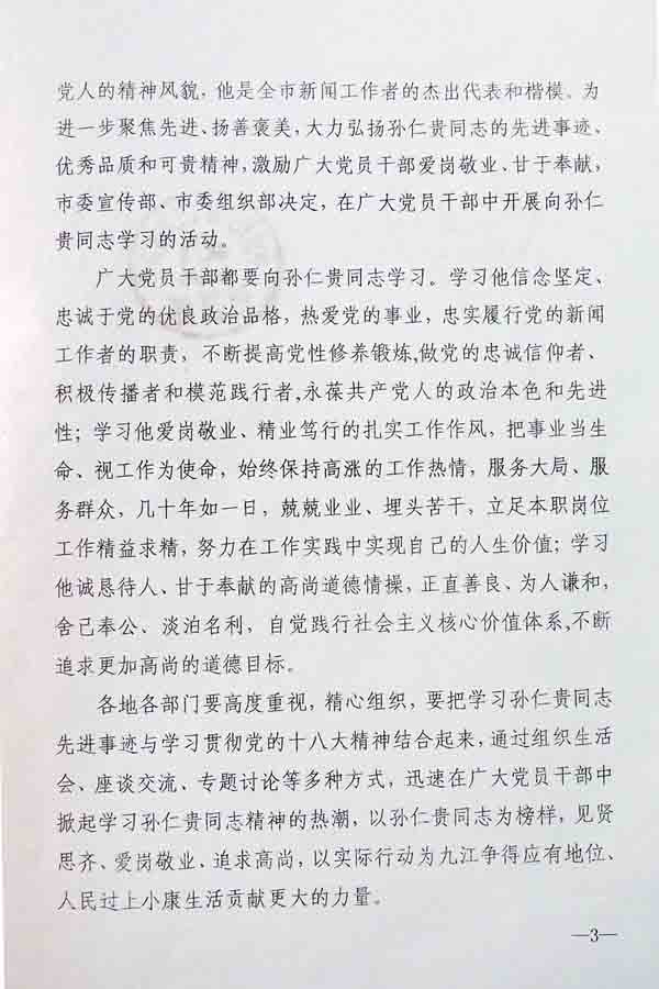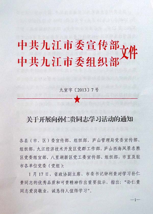 各县(市、区)委宣传部、组织部,庐山管理局党委宣传部、组织部,九江经济技术开发区党群工作部、庐山西海风景名胜区党委组宣部、八里湖新区党工委宣传部、组织部,市直及驻市各单位党委(党组): 1月17日,省政协副主席、市委书记钟利贵对学习孙仁贵同志的优秀品质和可贵精神作出重要批示,指出:“孙仁贵同志爱岗敬业,诚恳待人值得学习。” 孙仁贵同志生前是九江日报社主任记者、第十一届市政协委员。他1946年出生,中共党员,1964年12月应征入伍,军旅生涯21年,先后多次立功受奖,4次到越南参战,曾作为新华社昆明军区分社前线记者组成员参加收复老山、者阴山作战。1985年底转业到九江日报社工作27年,先后任要闻科编辑、副科长、科长、总编室主任、摄影部主任等职。作为骨干记者几乎参与了近30年我市所有重要会议、重大活动和重大事件的报道工作,几乎参与了近30年所有莅浔中央领导视察调研九江的摄影和报道工作,策划了大量弘扬主旋律、讴歌人间大爱的新闻选题,推出了一批撼动人心、产生巨大社会影响的新闻作品,取得了很好的社会反响和宣传效果,个人新闻摄影作品多次获得国家和省级奖项,获江西省先进工作者、九江市劳动模范等多项荣誉。2013年1月15日因病不幸逝世,享年67岁。孙仁贵同志始终坚持恪尽职守、无私奉献,坚持不懈地为新闻宣传事业忘我工作,把全部人生辉煌奉献给了新闻宣传事业,用生命生动诠释了一名共产党员的亮丽风采。 在九江日报社工作期间,他始终坚持对党忠诚、献身事业、敬业精业、厚德奉献的准则,以自己的高尚品德、敬业精神和模范行动,赢得了组织和业内外人士的高度赞誉。特别是2006年退休后,退休不退岗,工作劲头不减,奋斗在辛苦的新闻工作一线,以拳拳之心执着地为新闻宣传事业炙热奉献,深为社会各界敬佩。孙仁贵同志的先进事迹集中体现了当代优秀共产党人的精神风貌,他是全市新闻工作者的杰出代表和楷模,为进一步聚焦先进,扬善褒美,大力弘扬孙仁贵同志的先进事迹、优秀品质和可贵精神,激励广大党员干部爱岗敬业、甘于奉献,市委宣传部、市委组织部决定,在广大党员干部中开展向孙仁贵同志学习的活动。 广大党员干部要向孙仁贵同志学习。学习他信念坚定,忠诚于党的优良政治品格,热爱党的事业,忠实履行党的新闻工作者的职责,不断提高党性修养锻炼,做党的忠诚信仰者、积极传播者和模范践行者,永葆共产党人的政治本色和先进性;学习他爱岗敬业,精业笃行的扎实工作作风,把事业当作生命、视工作为使命,始终保持高涨的工作热情,服务大局、服务群众,几十年如一日,兢兢业业、埋头苦干,立足本职岗位工作精益求精,努力在工作实践中实现自己的人生价值;学习他诚恳待人,甘于奉献的高尚道德情操,正直善良、为人谦和,舍己奉公、淡泊名利,自觉践行社会主义核心价值体系,不断追求更加高尚的道德目标。 各地各部门要高度重视,精心组织,要把学习孙仁贵同志先进事迹与学习贯彻党的十八大精神结合起来,通过组织生活会、座谈交流、专题讨论等多种方式,迅速在广大党员干部中掀起学习孙仁贵同志精神的热潮,以孙仁贵同志为榜样,见贤思齐、爱岗敬业、追求高尚,以实际行动为九江争得应有地位,人民过上小康生活贡献更大的力量。 中共九江市委宣传部 中共九江市委组织部 2013年1月31日 |