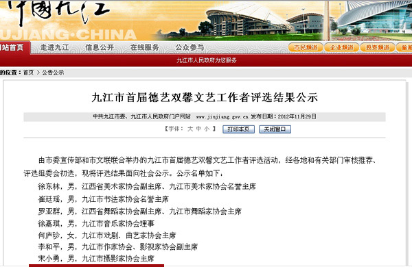 11月29日,《九江日报》、九江新闻网、中国九江网联合发布“九江首届德艺双馨文艺工作者评选结果公示”。由市委宣传部和市文联联合举办的“九江市首届德艺双馨文艺工作者”评选活动,经各地和有关部门审核推荐、评选组委会初选,评选出15名“德艺双馨文艺工作者”,九江市摄影家协会主席宋小勇榜上有名。