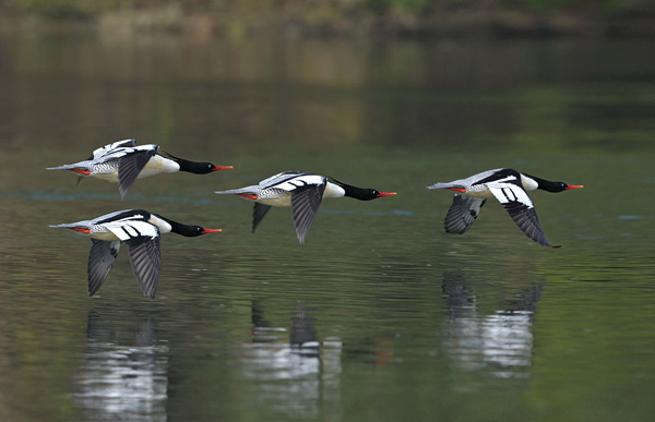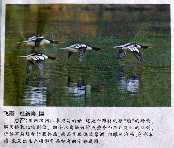 九江摄影网讯(宋小勇)6月18日的《中国摄影报》四版“家园”发表了九江杜新隆拍摄的作品《飞翔》,并加了点评。“点评”中说:用网络词汇来描写的话,这是个难得的很“萌”的场景。瞬间抓取比较到位,四个水禽恰好排成整齐而不乏变化的队列,俨然布局规整的装饰画。画面呈现偏暗影调,但曝光准确,色彩和谐,散发出生态摄影作品特有的宁静氛围。 杜新隆现为江西省摄影家协会会员、九江市摄影家协会常务理事。