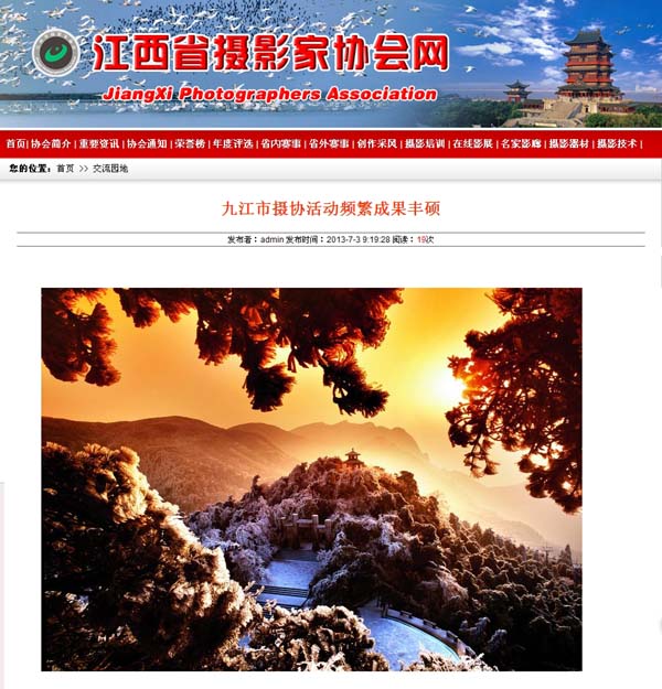 九江摄影网讯(木力)7月3日,江西省摄影家协会网以《九江市摄协活动频繁成果丰硕》为题,报道了九江市摄影家协会2013年以来的工作,并从5个方面给予了充分肯定。报道中说:2013年以来,九江市摄影家协会开拓进取,扎实工作,开展了一系列活动,取得了较好的成绩,主要体现在以下几个方面: 1、完善基层组织建设,增强协会发展后劲。九江市摄协积极支持有条件的新区、行业成立协会。3月2日,九江市八里湖新区摄影协会成立,选举产生了摄影协会主席团。彭泽县摄协主席张立新因工作原因需长驻上海办事处,5月21日,县摄协常务理事会扩大会议增补县摄协常务理事疏隶书为县摄协常务副主席,主持协会日常工作。九江市国税局摄影协会也在筹备当中,最近也将正式成立。这些协会的成立或人事的及时调整、充实,为协会正常开展活动打下了基础,也为协会的发展壮大增添了后劲。2013年上半年,经江西省摄影家协会“入会资格审查委员会”审核,九江有11位作者批准加入江西省摄影家协会,九江学院的女作者熊晓洁和庐山的张国兴两位作者批准加入了中国摄影家协会。至2013年上半年止,九江的中国摄影家协会会员达40人,其中女会员2人。 2、积极开展各项活动,增强协会的凝聚力。1月19日下午,九江市摄影家协会2013年迎新春联谊会在市金轩益君大酒店隆重举行。来自全市各基层摄协的350余名摄影爱好者会聚一堂,大家一起分享摄影给他们带来的快乐。联谊会上,表彰了2012年度先进集体、优秀会员。著名青年摄影家肖戈为影友作了《赞美自然》专题讲座。年初,开展了“2012年度九江市摄影界十大新闻”评选活动。九江市摄协第六届理事会常务理事、九江日报资深摄影记者孙仁贵同志病重和逝世后,市摄协利用“九江摄影网”的优势,开辟了“好人——孙仁贵”专题,介绍孙仁贵同志爱岗敬业、无私奉献、热心助人的一生,在市摄协的积极推动下,1月17日,江西省政协副主席、九江市委书记钟利贵对学习孙仁贵同志的优秀品质和可贵精神作出重要批示,中共九江市委宣传部、中共九江市委组织部发出《关于开展向孙仁贵同志学习活动的通知》(九宣字 [2013]7号文件)。3月22日,九江市摄协主席宋小勇、副主席蔡杰专程到庐山看望了因下雪在摄影中不幸摔伤骨折的市摄协常务理事殷锡翔,让广大会员感觉到了协会像家的温暖,协会的凝聚力聚增。 3、组织外出采风交流,开拓会员创作视野。3月11日,组织会员到吉安采风创作,聚焦庐陵文化的风味。4月13日,组织会员走进南昌凤凰沟,参加由江西省摄影家协会、江西农业摄协共同举办的《大众摄影》走进凤凰沟联谊活动。5月27日,组织会员参加由中国摄影家协会与萍乡市上栗县联合举办的“杨岐禅宗源·花炮祖师地”“上栗花炮杯”全国摄影大展启动仪式,并深入上栗境内开展采风创作活动。通过走出去,开阔了视野,学习到了其他地市举办大型活动的经验。 4、开展各项比赛活动,激发会员创作热情。在积极争取企、事业单位的支持下,上半年市本级单独或与基层摄协联合开展了“驿动风杯”九江市第三届舞蹈摄影比赛、“2013九江新湖第二届郁金香花博会摄影比赛”、“九江2013春季车展‘魅力八里湖·汽车新生活’摄影大赛”、第二届“建设杯”九江市城市建设摄影大赛、“西安古邑·石渡风情”摄影比赛、“秀美庐山区·光荣环卫人”摄影大赛等6个比赛活动,达到了月月有赛事;协助省摄协、中摄协组织开展的比赛有“天强杯——‘江西的表情’全民摄影大赛(月赛)”、“中信庐山西海”全国摄影大赛、“山水武宁”全国摄影大赛、“中国梦·劳动美”全国摄影大赛。特别是武宁县与江西省摄影家协会举办了“山水武宁”全国摄影大赛,为各县(市、区)开展高层次的摄影比赛做出了榜样。 5、创作成果捷报频传,获奖作者脱颖而出。武宁蒋德先的《奶奶的背膀是摇篮》,在由中国文联、农业部、中国摄协共同主办的第三届全国农民摄影大展中获得纪录类铜奖;庐山区缪华的《花为媒》(组照)、《起飞》(组照),在深圳“城央绿肾百鸟回归——首届生态公益观鸟季摄影大赛”中获得三等奖和优秀奖;庐山卫岌的《冬游天桥》,在由中国银行江西省分行和江西省摄影家协会联合举办的“百年中行杯——江西风景独好”摄影大赛中获得三等奖,九江还有6位作者的15幅作品获得了优秀奖;主席宋小勇的《鹅湖湾》在2013年校园开放日暨“媒体看师大”校园一日摄影大赛中获得二等奖,《全神惯注》在 “读书与我”第三届“读好书”活动摄影比赛中获得三等奖;副主席叶建华的《矿工兄弟》,在第17届意大利盛大4地巡回联展中获得彩色自由组第二名;副主席罗匡龙的《南昌夜景》《梅岭登山》《户外用品店内场景》,在由极限户外网主办的第三届摄影年会暨极限摄影家主题摄影大奖赛中获得一等奖,他的摄影实践文章《多重曝光的乐趣》,在5月1日的《人民摄影》报第13版“谈影论道”专版发表,并配发了3幅作品;彭泽马素荣的《食用菌》(组照)、宋军的《甜蜜的事业》,九江县方乐新的《博莱现代化生猪屠宰车间》,在由江西省农业厅、江西省摄影家协会主办的“走进希望的田野”为主题的“煌上煌杯”江西农业摄影大赛中获得铜奖;特别是九江作者在由庐山风景名胜区管理局、中国摄影家协会共同主办的“庐山梦·中国情—