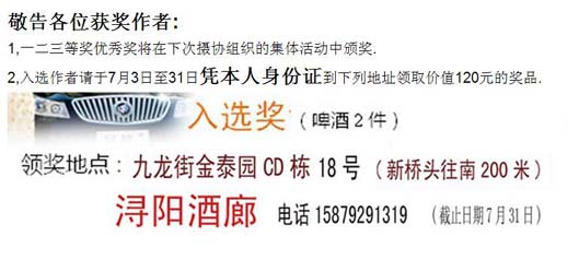 九江摄影网讯(蔡杰)备受瞩目的、由九江日报社、九江市摄影家协会、浔阳晚报报业发展有限公司联合举办的“九江2013春季车展‘魅力八里湖·汽车新生活’摄影大赛”于日前揭晓。本次大赛创作时间仅限3天,共收到136位参赛作者的近500幅(组)参赛作品。通过评委评比,再听取、参考、综合赣州、吉安、太平洋保险公司等摄协摄影家们的意见,最终确定了1个一等奖,2个二等奖,3个三等奖,10个优秀奖和33个入选作品(获奖和入选名单附后)。