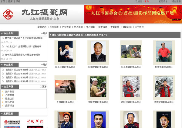 九江摄影网讯(宋小勇)今天,当摄影朋友国庆假日在家打开“九江摄影网”主页或进入“九江摄影网论坛”时,就会发现网页版面有所调整,主页上增加了“国会会员摄影作品展区”。这次开辟的国会会员作品网展,推出了18位九江的中国摄影家协会会员作品260多幅(组),并为每个参展会员都设置了单独的展示页面,且配有个人照片和介绍。旨在给大家提供一个相互认识,学习交流的平台。18位摄影家采取自我推荐和协会约稿等形式组成,由于时间关系可能还不完善,摄影家们还可补充和完善作品。也欢迎没有进入首批推介的国会会员向网站提供自己的作品和个人介绍。 九江摄影网在推出“国会会员摄影作品展区”的同时,还补充了《摄影》报2012年出版的电子版;对之前主页上的友情网站链接错误,也进行了修正。据了解,官方网站举办国会会员摄影作品网络展,在江西省地市摄影家协会中九江尚属首创。