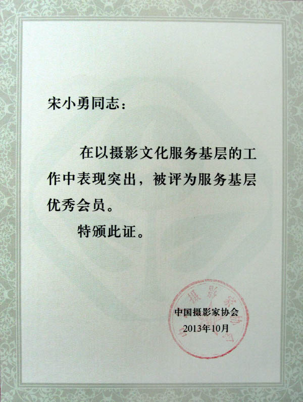 九江摄影网讯(木力)10月21日,中国摄影家协会在陕西渭南对近年来在以摄影文化服务基层工作中表现突出的全国102名优秀会员进行了表彰。九江市摄协主席宋小勇名列表彰之中。